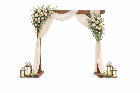Open-frame arch Approximate dimensions: Height: 7–8ft Width: 6–7ft. Draping: Ivory (cream white) Style: Soft, romantic drape FLORAL DECORATION Premium artificial flowers (real touch) Colors: White, cream, and sage green Style: Organic / romantic ADDITIONAL DECORATION 4 decorative vintage-style lanterns LED candles included (safe for outdoor use) Green foliage (natural or artificial)