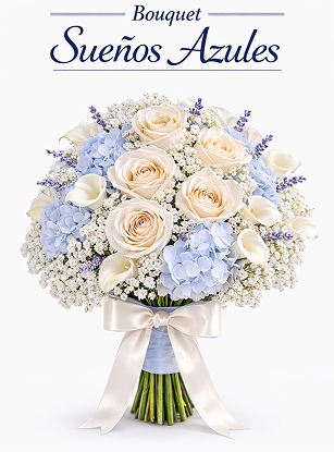 This elegant bouquet blends soft, romantic tones with light blue hydrangeas and twelve white roses, creating a fresh and refined look.