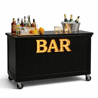 This modern black mobile bar station is perfect for weddings, private parties, and corporate events. It features a spacious surface for cocktail preparation and storage for bottles and drinks.