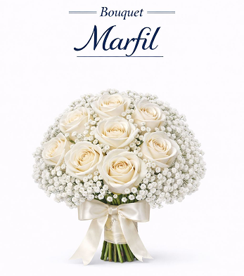 This elegant bouquet features twelve ivory roses paired with soft baby’s breath, symbolizing purity, sincere commitment, and everlasting love. Its classic design adds a refined touch, perfect for romantic and timeless weddings.